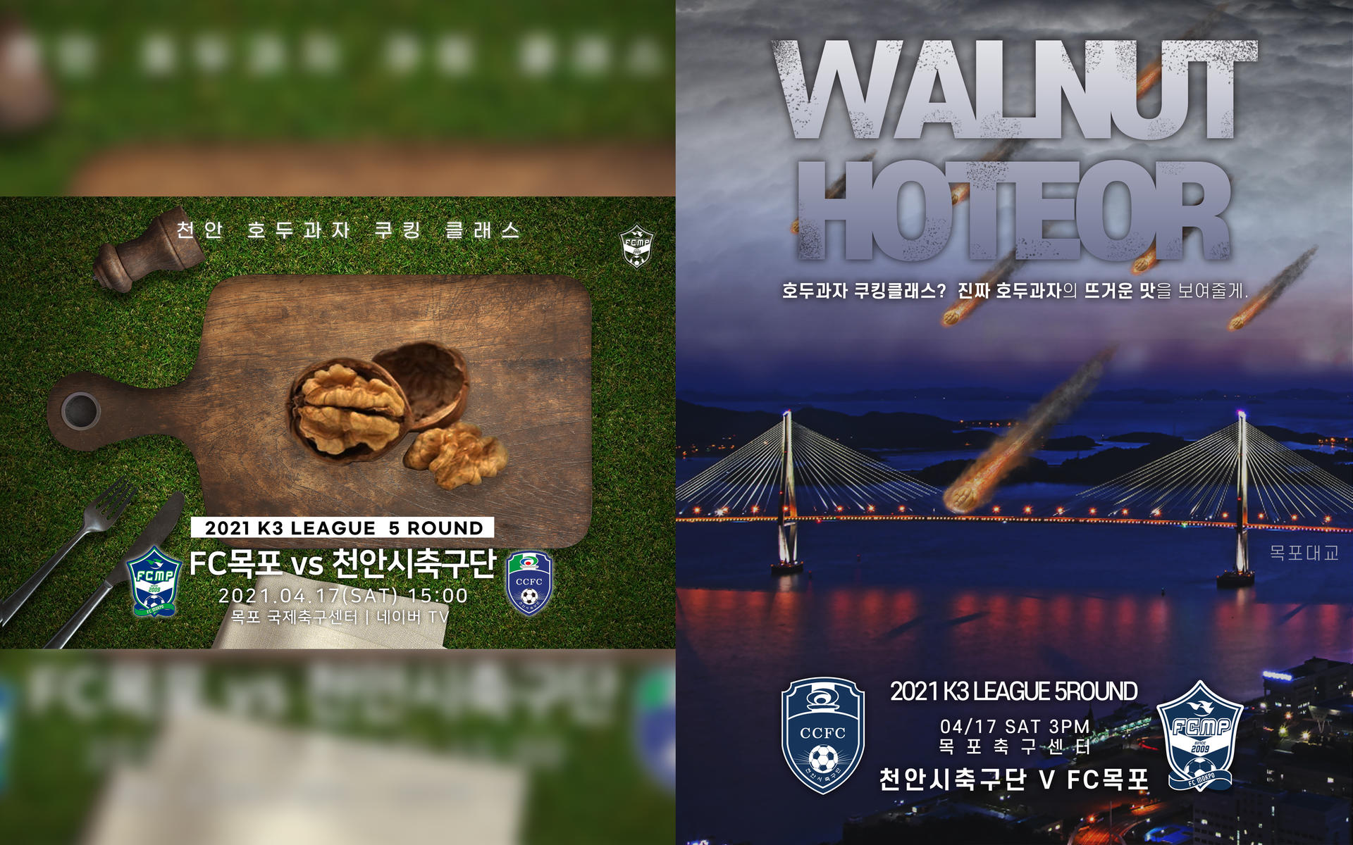 한편, 천안과 목포는 K3리그 5라운드 경기를 앞두고 포스터로 ‘도발전’을 가졌다. 먼저 목포에서 ‘천안 호두과자 쿠킹 클래스’라며 천안의 대표 간식 호두과자로 도발해왔다. 이에 천안은 ‘WALNUT HOTEOR(호두 + 유성의 합성어)’가 적힌 호두 메테오가 목포대교로 떨어지는 포스터로 ‘진짜 호두과자의 뜨거운 맛을 보여주겠다’고 대응하며 긴장감을 한층 고조시켰다. 천안과 목포의 경기는 네이버TV를 통해 생중계된다.