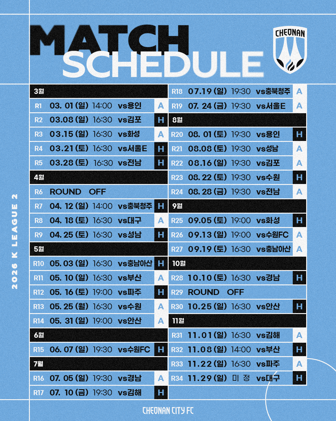 한국프로축구연맹이 ‘하나은행 K리그2 2026’ 일정을 발표한 가운데, 천안시티FC는 3월 1일(일) 오후 2시 용인FC와의 원정경기를 시작으로 리그에 돌입한다. 이어 3월 8일(일) 오후 4시 30분 김포와 홈개막전을 통해 홈 팬들과 새 시즌 첫 인사를 나눈다.